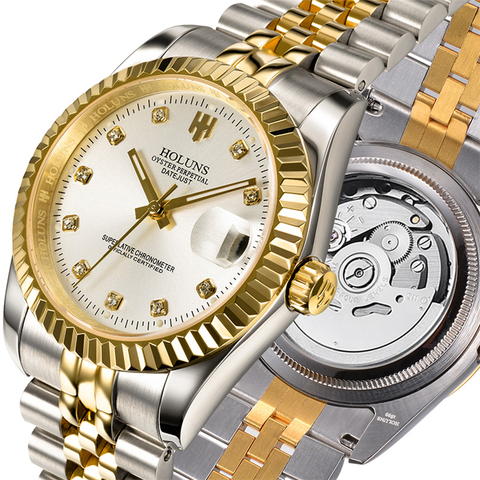 HOLUNS HLS001 الكلاسيكية الذهب ساعة أوتوماتيكية الرجال الصلب الكامل اليابان NH35A ساعات آلية 10 بار مقاوم للماء ساعة اليد للرجل